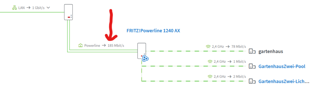 Am Samstag habe ich viel herum experimentiert und die Verbindung auf 185 Mbit/s gebracht. Den Wert verbuche ich jetzt mal als lokales Optimum, zufrieden bin ich damit aber noch nicht. In der Unterverteilung im Haus habe ich direkt an das Kabel, das in den Schuppen geht, eine Steckdose gelegt. Und im Gartenhaus habe ich auch eine Steckdose direkt an die Zuleitung gebaut. Der Speedtest von Google zeigt jetzt 51,2 Mbit/s im Gartenhaus am Laptop an, am Freitag waren es noch 12,1 Mbit/s. Das ist jedenfalls schon mal viel besser.