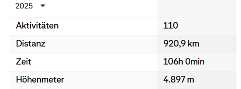 Ansonsten bin ich auch noch viel Rad gefahren, 99 Einheiten und 1.579,7 km sagt Strava. Das ist nicht wenig. Nach dem Marathon hatte ich ja erst mal einige Zeit keinen Bock mehr aufs Laufen und bin nur noch Rad gefahren. Diese Tour war Zufall aber danach war klar dass ich ein besseres Rad brauche. Und im Nachhinein muss ich sagen dass das Gravel-Bike die Top-Anschaffung 2025 war. 2025 war also wenigstens ein gutes Sportjahr.