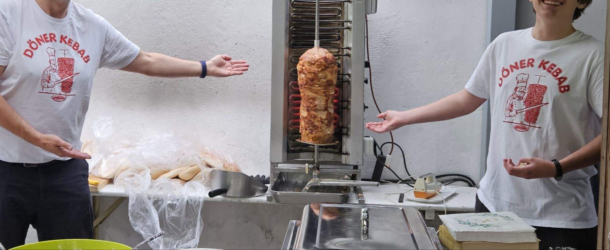 Ja, so ein Döner-Grill ist eine super Sache und sollte eigentlich in keinem gut sortierten grillaffinem Haushalt fehlen. Die Möglichkeiten sind quasi grenzenlos: kleiner Döner, großer Döner, mit schaaf und mit ohne schaaf, Hühnchen, Pute, Lamm oder Kalb, Dürüm oder Dönerbrot. Das ergibt grob 3.628.800 Kombinationen und heißt man ist flexibel ohne Ende. Super, und passende Kleidung konnten wir auch noch organisieren. Eine rundum gelungene Show-Einlage.